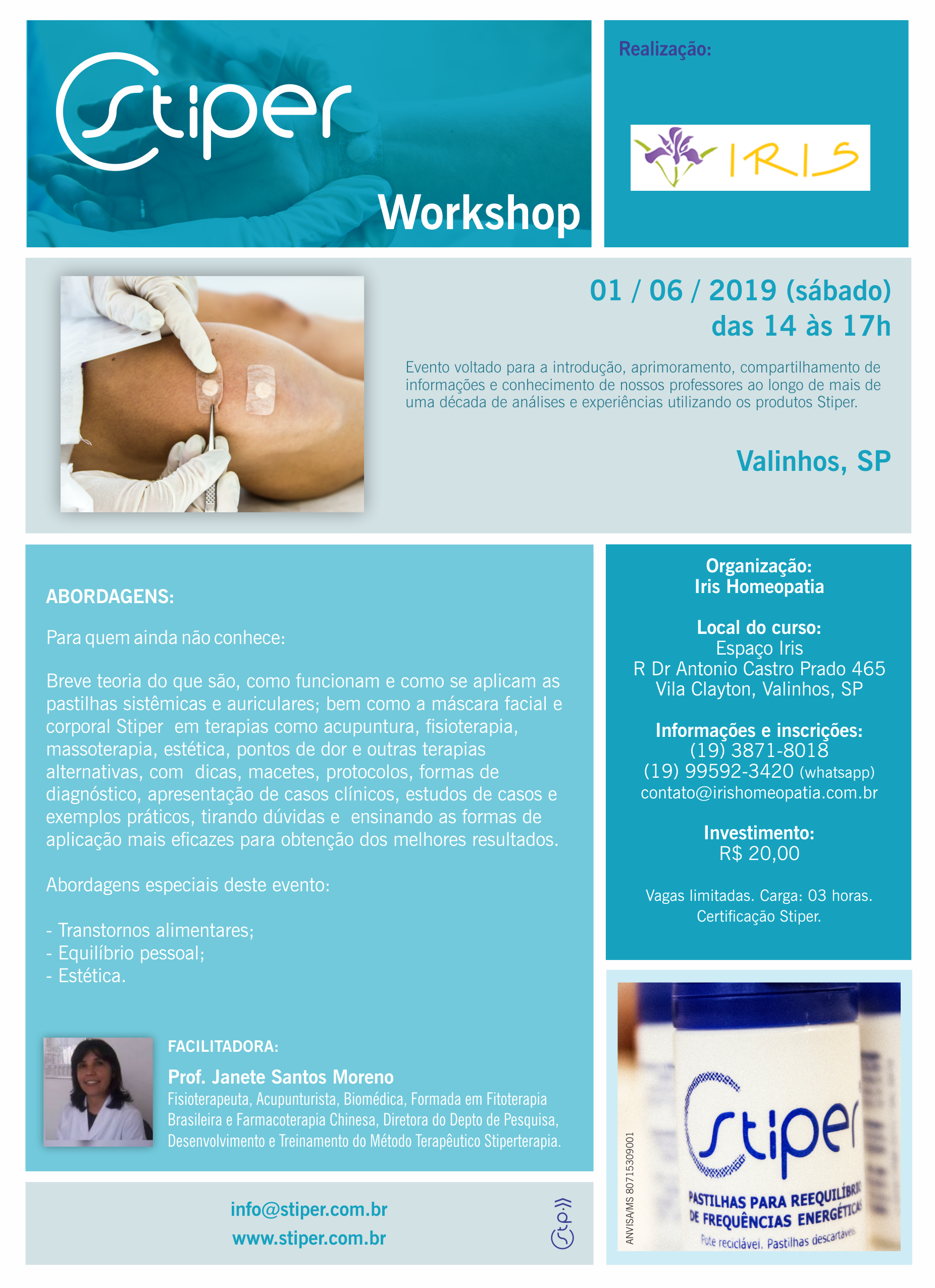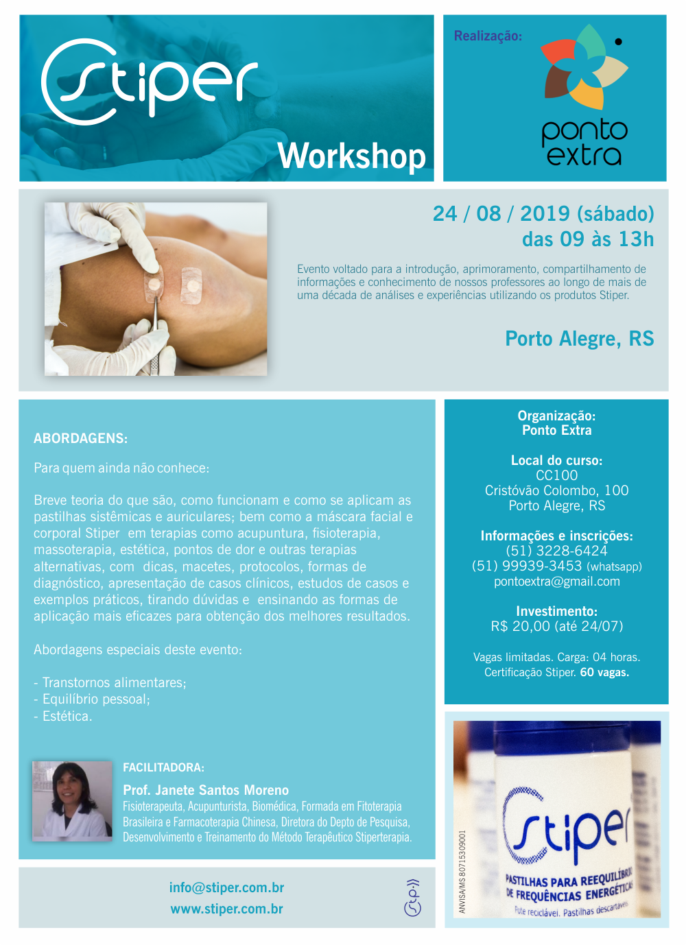 - Histórico e mecanismo de ação das Pastilhas Stiper, cuidados básicos e aplicação, anatomia e fisiologia dos Meridianos Tendinomusculares, forma de avaliação diagnóstica, principais pontos de acupuntura e funções associadas.